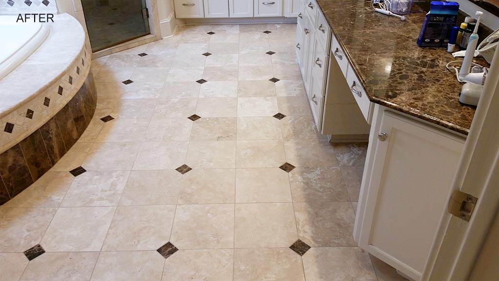 With time and traffic, no matter how diligent a housekeeper you are, eventually your floors stone will show wear and buildup of scratches, dirts and oils that require more than a standard mopping. This once vibrant honed travertine floor with marble inlays in this Austin, TX master bathroom was in fine condition — it was simply overdue for a professional cleaning.